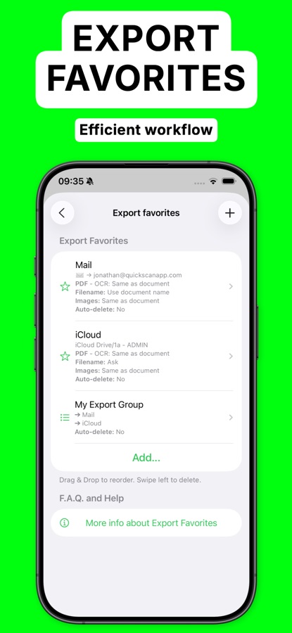 • Save to cloud services with Favorites (iCloud Drive, Dropbox, Google Drive, OneDrive, WebDAV, paperless-ngx, pCloud, NAS, SMB, NextCloud, and more)