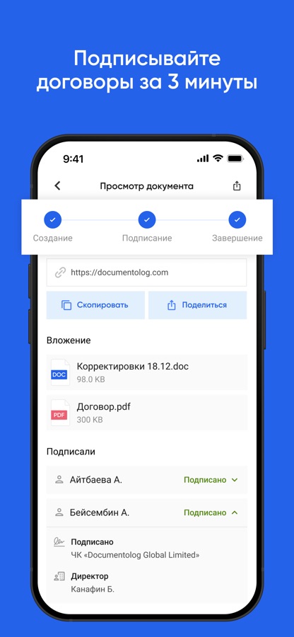 В мобильном приложении Вы сможете подписывать документы online с ЭЦП, включая договоры и трудовые договоры с Вашими сотрудниками с автоматической отправкой и регистрацией договоров на портале enbek.kz. С Documentolog Mobile решать важные вопросы можно без привязки к вашему офису прямо с Вашего устройства.
