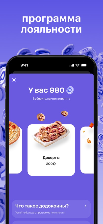 В Додо Пицца встроена программа лояльности с внутренней валютой «додокоины». За каждый заказ вы получаете баллы, которые можно копить и тратить на скидки или бесплатные продукты. В приложении публикуются персональные акции, например, скидка на день рождения. Додокоины начисляются автоматически, баланс отображается в профиле. На iOS виджет показывает текущее количество бонусов, а push-уведомления сообщают о новых акциях и сгорающих баллах.