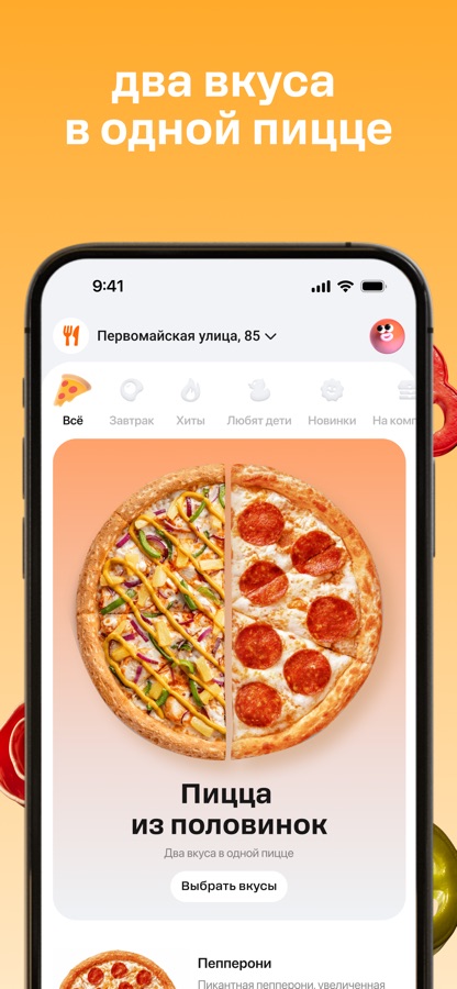 Главная фишка Додо Пицца — создание блюда по своему рецепту. Выбирайте основу (классическое или тонкое тесто), добавляйте или убирайте любые ингредиенты. Функция «Пицца из двух половинок» объединяет два разных вкуса в одном заказе — удобно, когда компания не может договориться. На iOS управление кастомизацией интуитивно: вы касаетесь ингредиентов, и их количество меняется в реальном времени. Сохраняйте любимые рецепты для быстрого повторения. Основные возможности: