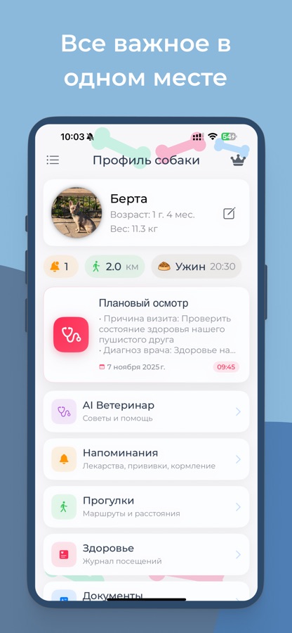Умный уход за питомцем на базе ИИ. Следите за прогулками, контролируйте здоровье, планируйте визиты к ветеринару и получайте быстрые советы — всё в одном приложении.