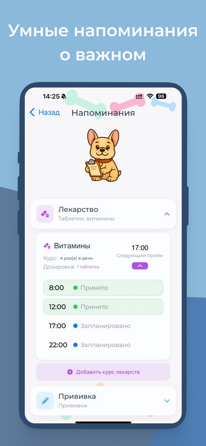 • Умные напоминания — кормление, лечение, прогулки