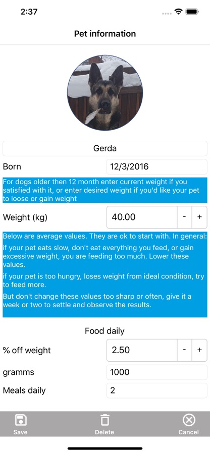 С этим приложением теперь гораздо проще управлять весом собаки. Поддерживать его стабильным в случае если он идеален, или набирать или снижать вес собаки, в случае необходимости.