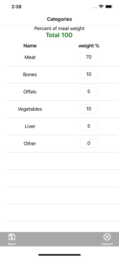 Приложение содержит базу основных продуктов и субпродуктов, используемых в кормлении собак сырыми продуктами (мясо, курица, индейка, рыба и их субпродукты, овощи, фрукты). В случае, если необходимого вам продукта нет — вы можете всего сохранить в программе информацию о нем.