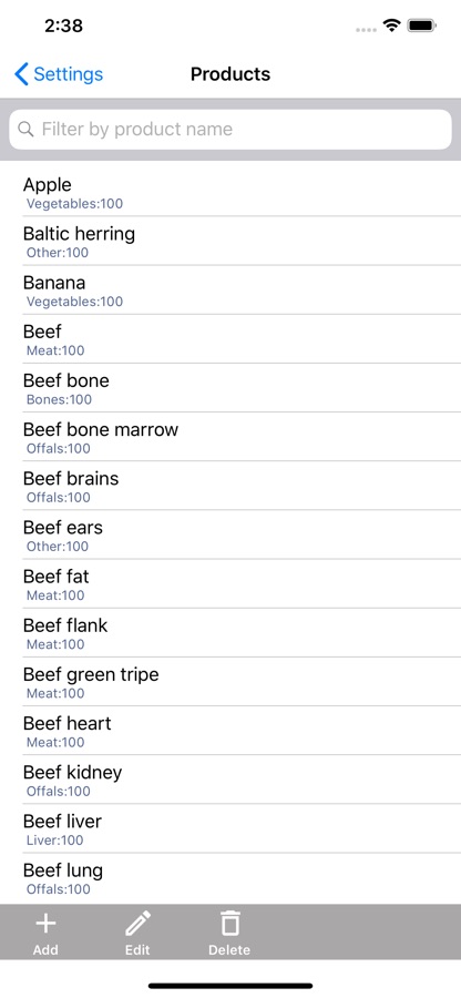 — вести базу продуктов (калорийность, белки-жиры-углеводы, стоимость ) или пополнять ее с нашего сервера, который содержит набор основных продуктов, используемых в видотипичном кормлении собак по моделям БАРФ или Prey