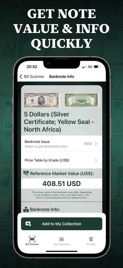 Dollar Bill Scanner app turns your device into a powerful, fast and accurate banknote scanning, identification, value and collecting tool! Just snap photos of both sides of the banknote and get the scan result in seconds with detailed info about your note. Improve your banknote collecting experience and expand your knowledge with this helpful app.