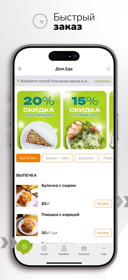 У нас Вы можете заказать блюда на завтрак, обед и ужин! Оформить заказ удобно через приложение – всего 2 клика и мы уже доставили Ваш заказ!