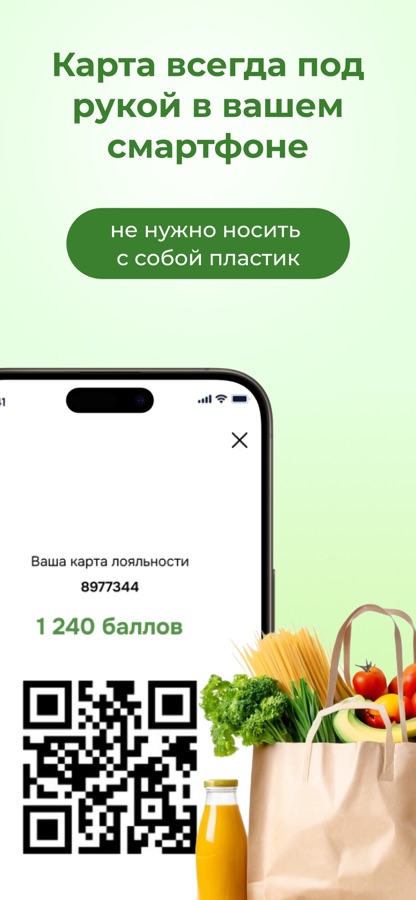 — Карта у вас в телефоне! Больше не нужно носить с собой пластик! Сканируйте прямо на кассе с экрана смартфона. А также в приложении можно проверить количество накопленных бонусов и воспользоваться ими при онлайн заказе или покупке в магазине.