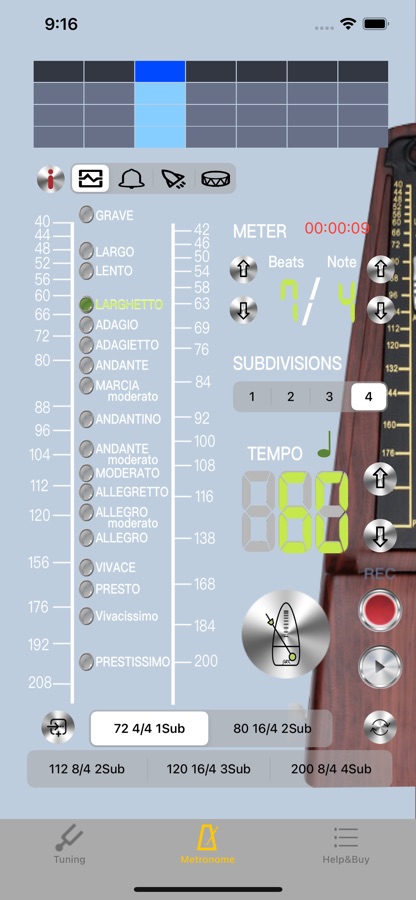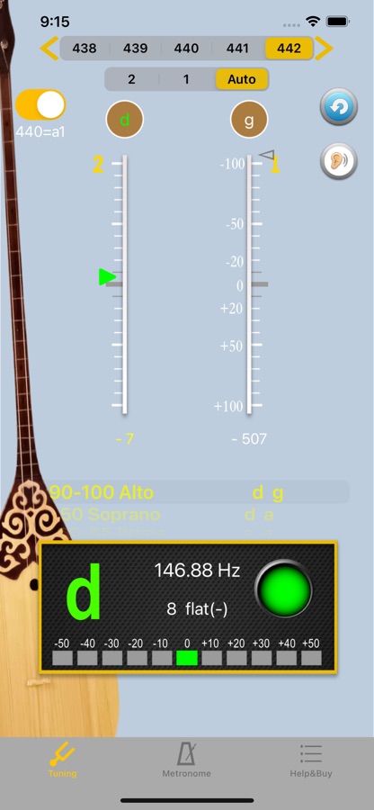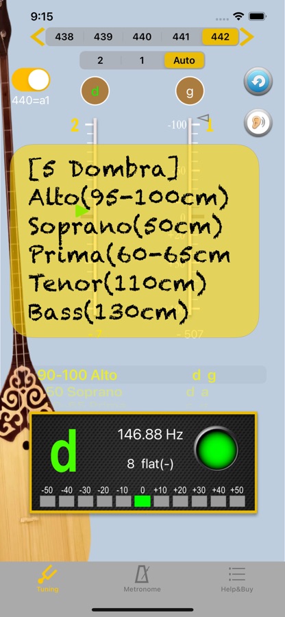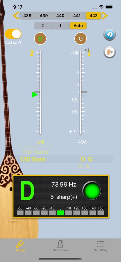 Простой пользовательский интерфейс с фильтрацией шума может помочь вам настроить 2 строки с простой настройкой при активации APP. Первый шаг — выбрать частоту в верхней части экрана, затем выбрать настройку в середине экрана. Когда вы вытаскиваете строку Домбра, высота будет отображаться на панели для отдельной строки, указывая высокий или низкий уровень сигнала.