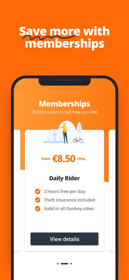 With a Donkey membership, you pay a fixed monthly fee and get a certain amount of free time per day. If you exceed the included daily free time, your rental is extended for a low fixed cost. Ideal for the daily commute and for a busy city life with multiple errands throughout the day. Valid in all Donkey cities.