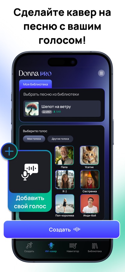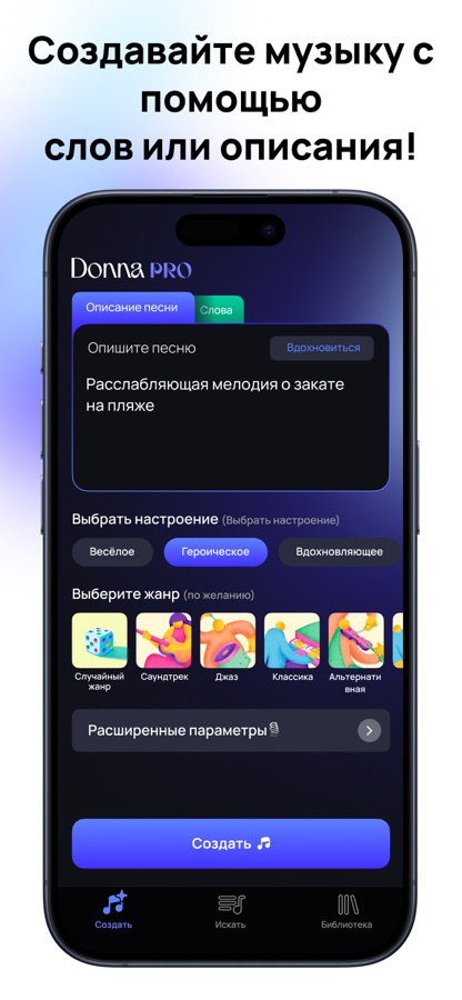 — Мгновенное создание песен: Опишите свои эмоции, и Donna сделает все остальное. Создавайте и продюсируйте. Благодаря волшебству ИИ — музыкальная студия у вас всегда в кармане.