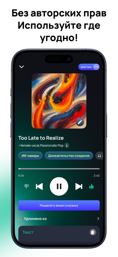 Инновационный ИИ для создания музыки: В основе Donna лежит революционный ИИ, который понимает все тонкости музыкальных жанров, инструментов и вокала. Приложение создает песни с текстом и реалистичным звучанием за считанные секунды на основе описанных вами эмоций.