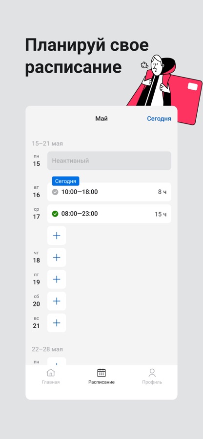Для старта работы зайди в свой аккаунт и открой смену. Включи push-уведомления в настройках телефона, чтобы получать важные сообщения.