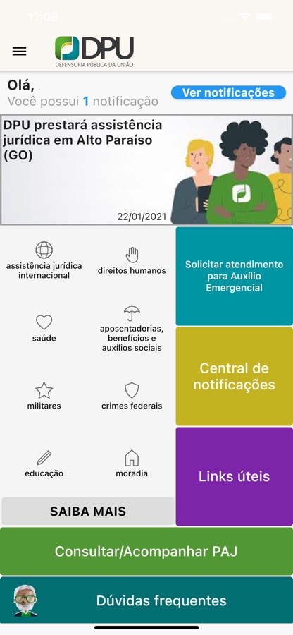 Aplicativo da Defensoria Pública da União (DPU) destinado às pessoas que queiram acompanhar um ou mais processos de assistência jurídica (PAJ’s). O próprio assistido, ou até uma pessoa que tenham em mãos os dados do processo, poderá realizar o acompanhamento pelo aplicativo, receber e responder solicitações da Defensoria Pública (informações e envio de documentos). É possível, também, solicitar assistência inicial para questionar o indeferimento do auxílio-emergencial. É necessário logar no aplicativo com uma conta Gov.Br, que poderá ser cadastrada no momento do login, através do próprio aplicativo.