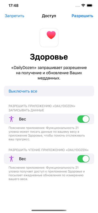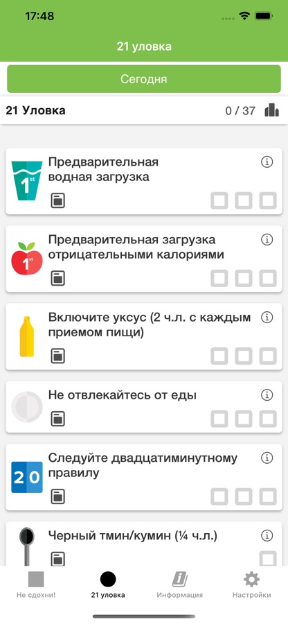 Функциональность 21 Уловка, основанная на книге «Не сдохни на диете», также предоставляет трекер для контроля веса. Трекер веса может использовать приложение «Здоровье», чтобы сохранять в нем данные по весу, введенные вручную, или чтобы читать данные по весу из таблиц приложения «Здоровье».