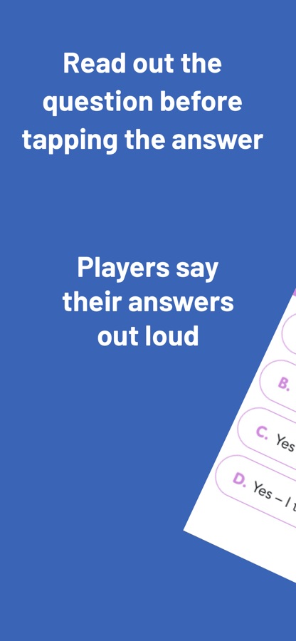 Select from our 6 categories or randomise them. Take turns answering taboo questions from multiple choice answers. Once everyone has guessed what they think you would pick, swipe to reveal the answer. The friends who guessed wrong, have to drink!