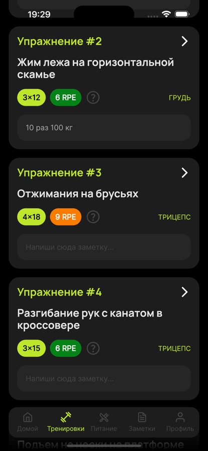 — Дневник тренировок и заметки к каждому дню для фиксирования результатов.