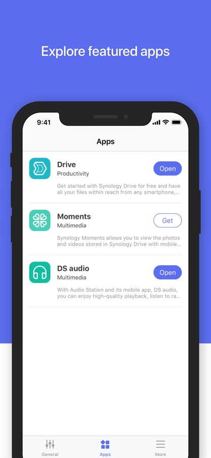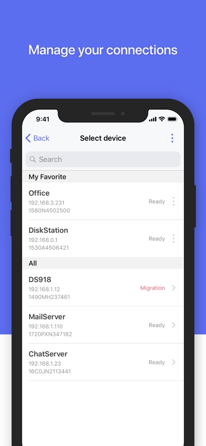 DS finder allows you to set up and manage your Synology NAS, sends you NAS-related notifications, and opens your door to the world of Synology apps. And yes, all these features can be accessed directly from your phone, so wave goodbye to complicated setup and management with DS finder!
