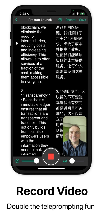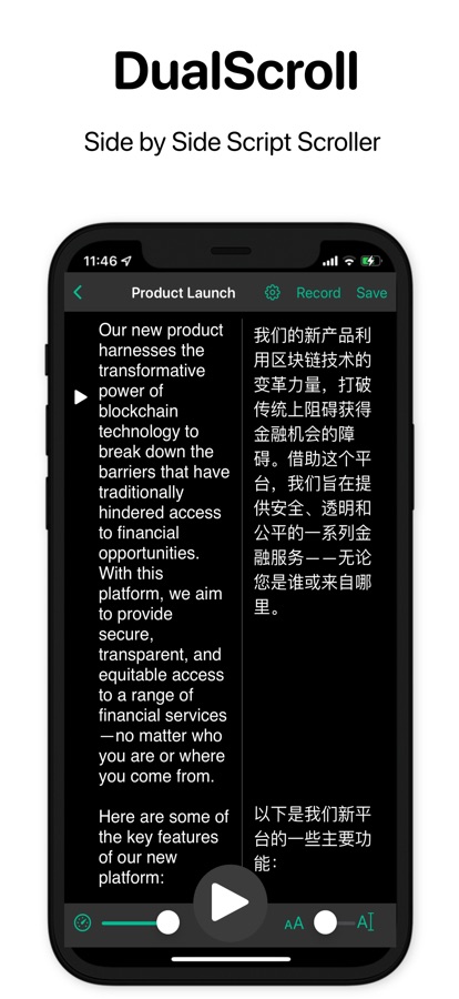 DualScroll scrolls two different scripts while you read so you deliver your lines flawlessly without looking down. Record yourself while reading the script for the illusion of great eye contact and script memory.