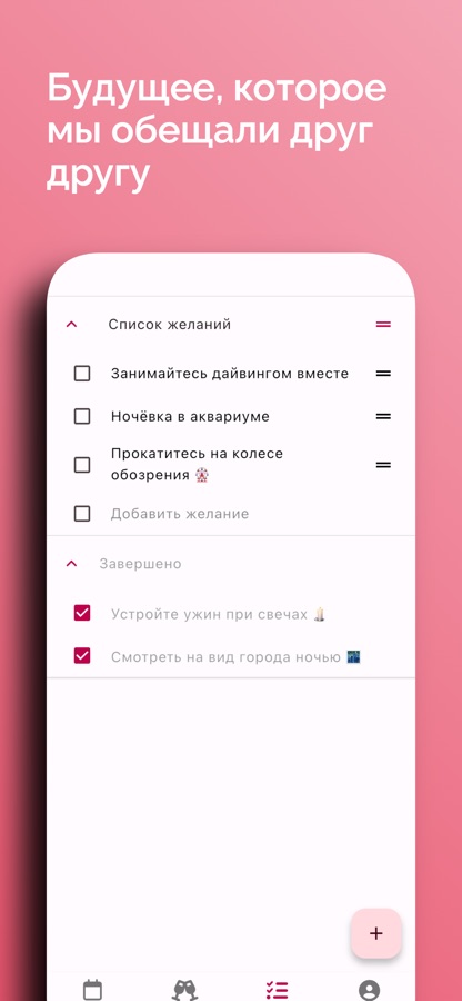 Никаких ежедневных романтических заданий. Никаких рейтингов привязанности. Только то, что вам действительно нужно: общий календарь, отслеживание годовщин и список желаний, который видят оба.