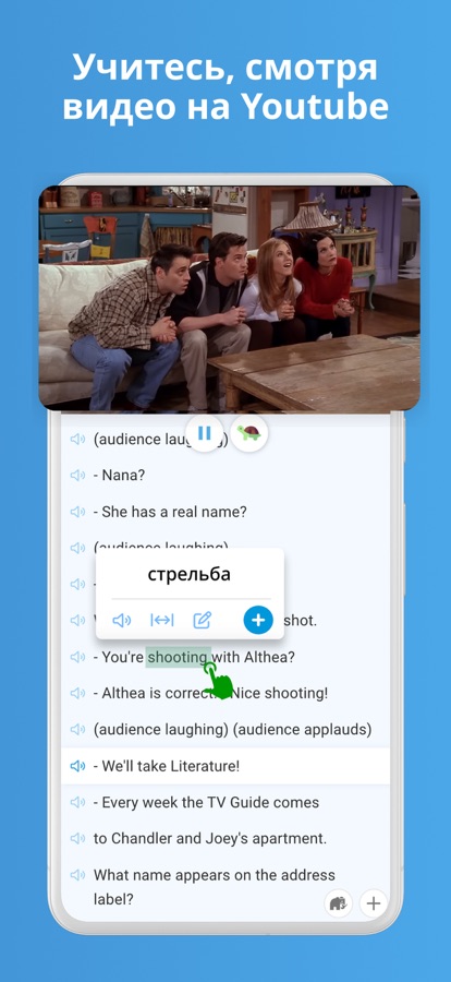 Смотрите любое видео на YouTube с субтитрами и извлекайте уроки из него. Нажав на неизвестные слова, вы остановитесь и отобразите переводы.