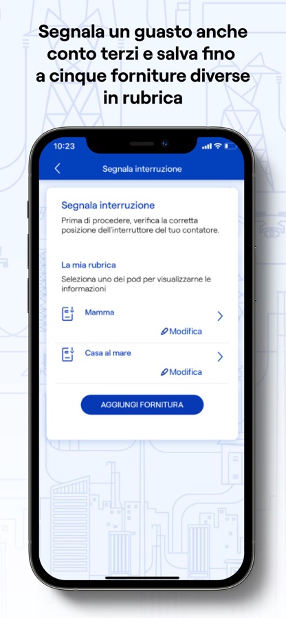 Grazie alla funzionalità “La mia rubrica” puoi salvare fino a cinque utenze diverse dalla tua: in questo modo potrai rapidamente verificare e segnalare interruzioni anche per un tuo familiare o un tuo conoscente.