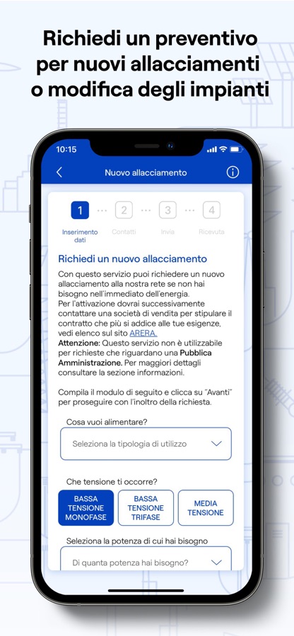 Benvenuto nell’App di E-Distribuzione, che permette di gestire in autonomia le forniture elettriche servite della nostra rete. L’applicazione è dedicata ai clienti con forniture domestiche, business e ai produttori di energia elettrica.