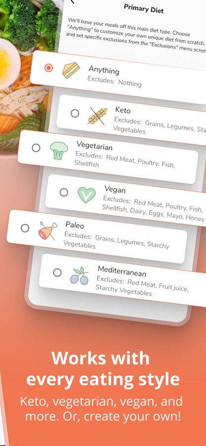 — Follow any eating style or create your own (works for keto, paleo, vegetarian, vegan, and more)