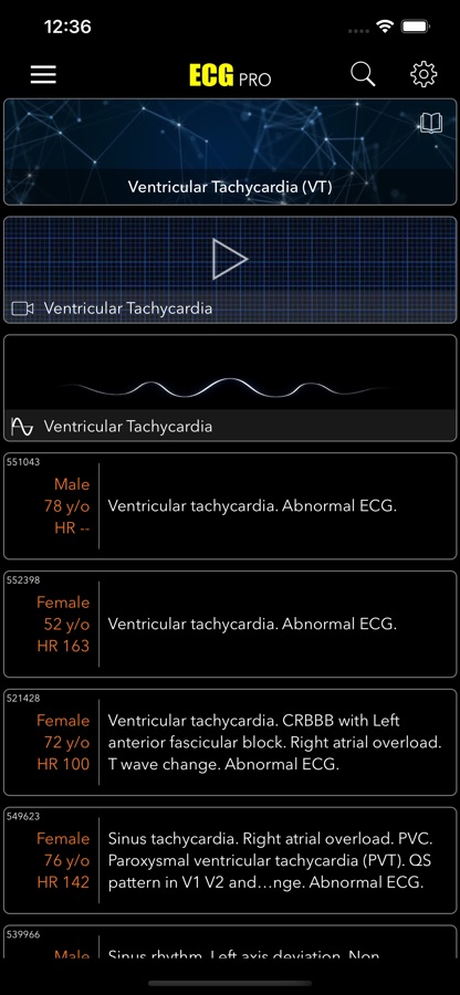 1) Browse ECG cases by findings like «Atrial Flutter», «Escape Rhythm» and more