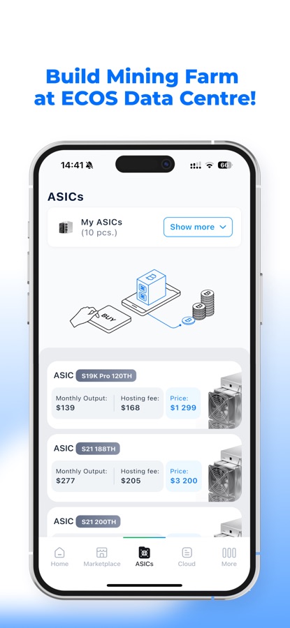 Приобретайте и размещайте мощные майнеры Bitcoin, такие как серия Antminer S21, прямо через приложение ECOS.