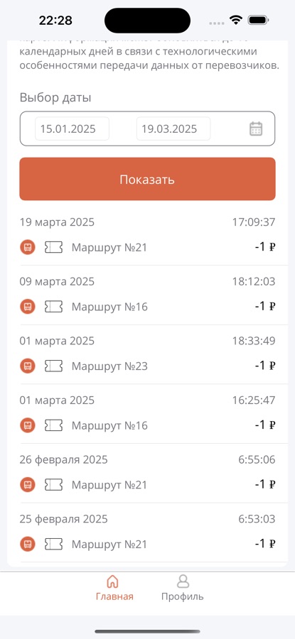 Информация о транспортных картах, поездках, пополнениях и ошибках оплаты на транспорте. Есть возможность просмотреть билеты, чеки оплаты. Для некоторых регионов доступно пополнение транспортных карт через СБП
