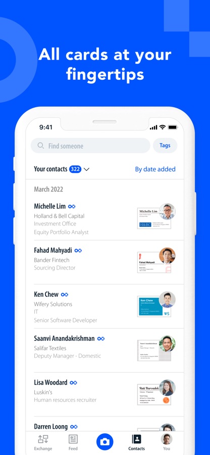 Search by name, company name, department, or position, and use full-text search of memos and grouping by tags, to quickly find the information you need after scanning biz cards.