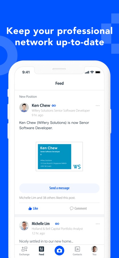 When you connect with someone via Eight, you’ll be notified when they change their biz card because of a career move such as a promotion or job change. You can also message your contacts via Eight and build your relationships, , keeping scanned information current.