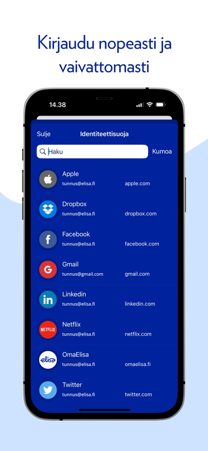 Elisa Identiteettisuojan avulla tallennat ja säilytät turvallisesti kaikki salasanasi, käyttäjätunnuksesi, sähköpostiosoitteesi, PIN-koodisi, pankki- ja luottokorttisi sekä verkkopankkitunnuksesi.