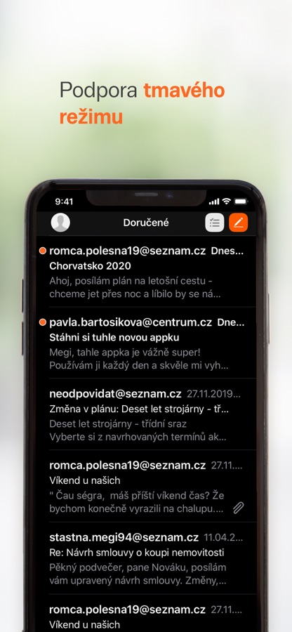 V kompletně přepracované aplikaci Email.cz od Seznamu máte svou schránku všude s sebou. Složky se zprávami budete mít kdykoliv po ruce. Starší zprávy snadno najdete v rychlém vyhledávání. Pokud máte schránek víc, můžete mezi nimi jednoduše přepínat. Aplikace se přizpůsobí tmavému režimu vašeho telefonu. Díky offline režimu můžete poštu vyřizovat i bez internetu a jakmile se zase připojíte, zprávy se automaticky odešlou. Posilujeme také bezpečnostní prvky aplikace.