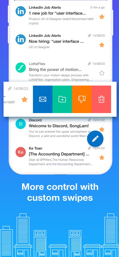 ◆ Categorize emails with swipe gestures that help you quickly archive, delete, flag, or mark messages as read or unread.