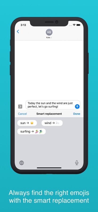 — Smart replacement: when switching to the emoji keyboard, the app will suggest emojis based on the context.