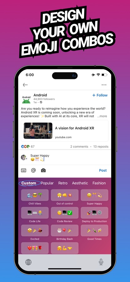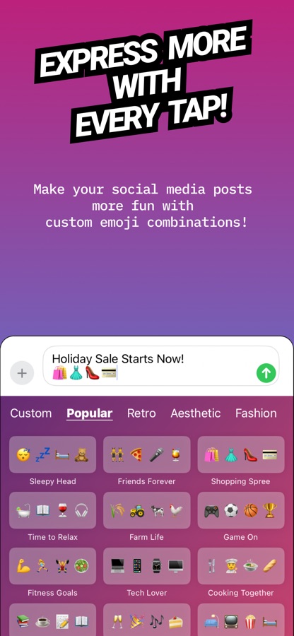 Emojix is a powerful emoji keyboard app for iOS that lets you browse and create unique emoji combinations directly from your keyboard, no matter which app you’re using. Whether you’re texting, posting on social media, or chatting in any other app, Emojix gives you quick access to a wide variety of pre-made and custom emoji combos. Express yourself in creative ways with ease, all without switching between apps!