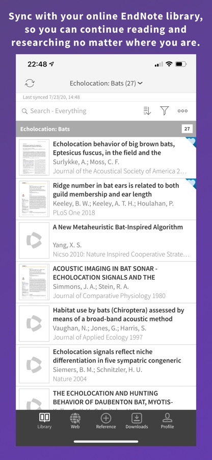 EndNote enables you to easily view, edit, organize, and share research material on your iOS device. By syncing your research library across iOS, online, and desktop, you increase the power of EndNote by gaining seamless access to your reference library from multiple devices and platforms.