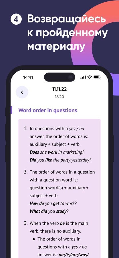 Возвращайтесь к изученным ранее темам, если хотите освежить знания. В приложении вы можете повторить грамматику и лексику, просмотреть выполненные упражнения, перечитать тексты и прослушать аудио.