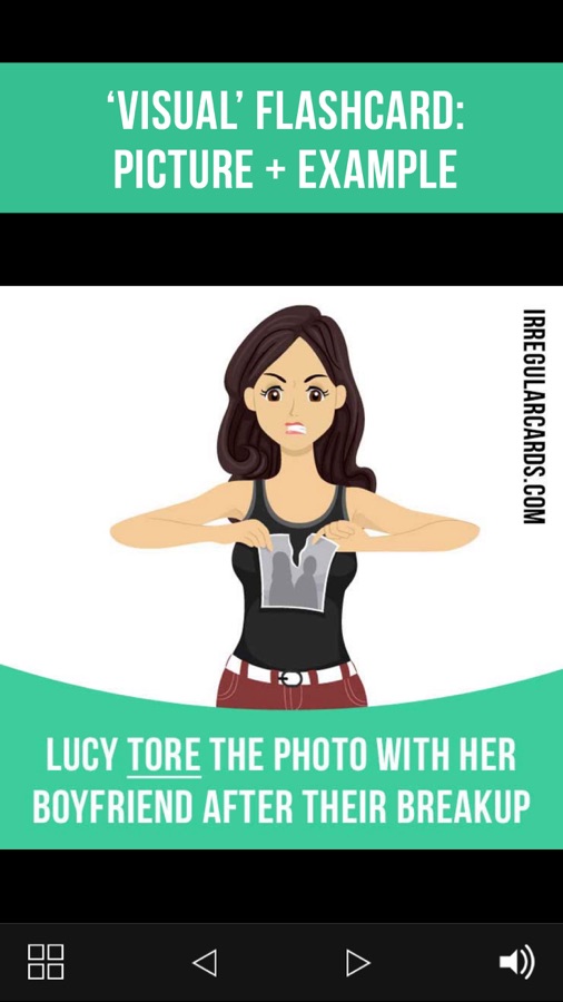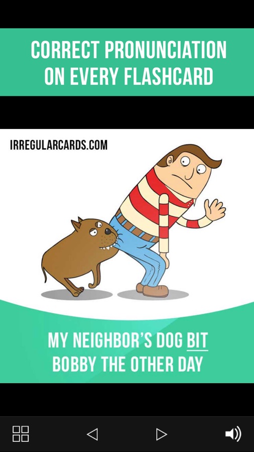 In our app you will find 500 flashcards containing irregular verb forms, meanings, example sentences, pictures and correct pronunciation.