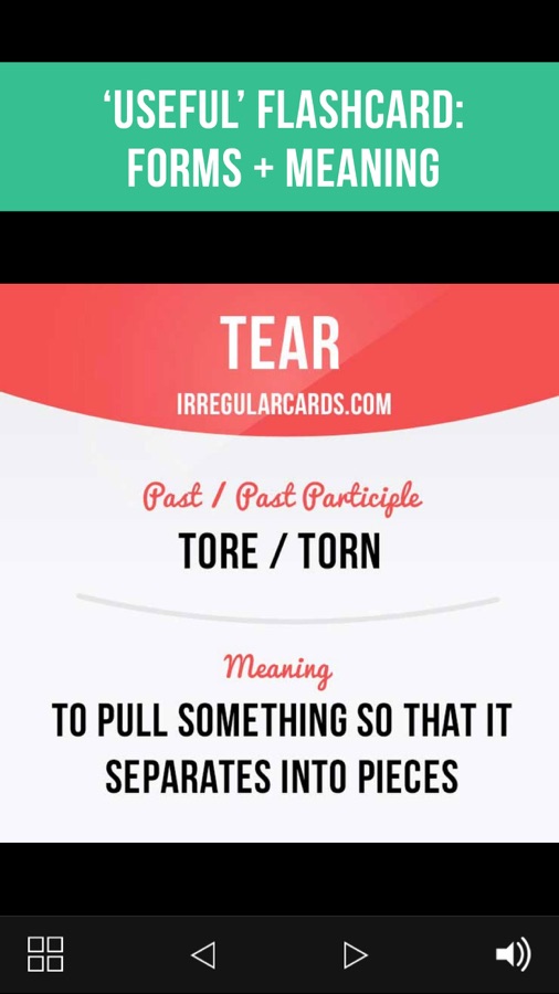 1. ‘Useful’ flashcard shows you an irregular verb, its forms and meaning.