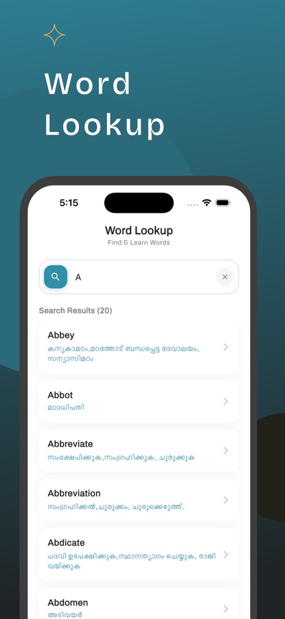 # You can search both English and Malayalam words. You can search words directly from «Internet Browser» or other Applications by using Sharing option