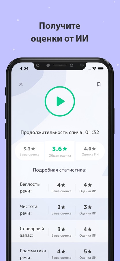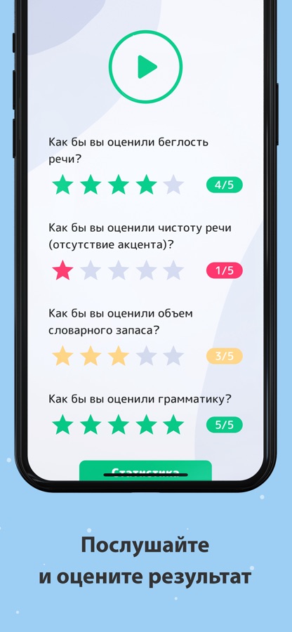 English speaking включает в себя сотни интересных вопросов и тем для тренировки разговорных навыков. Сначала приложение генерирует случайную тему, на которую вы можете либо начать говорить, либо пропустить ее. Пока вы говорите на случайную тему, приложение записывает ваш голос, чтобы ИИ смог проанализировать спич после завершения. После того как вы закончите говорить, необходимо прослушать свою речь и оценить себя по нескольким критериям: беглость речи, чистота речи, объем словарного запаса и грамматика. В то же время искусственный интеллект также проанализирует вашу речь и выдаст справедливую оценку. В итоге, ваш виртуальный репетитор по английскому подсчитает средний балл и сохранит ваш спич и результаты по нему для будущего анализа или попыток.