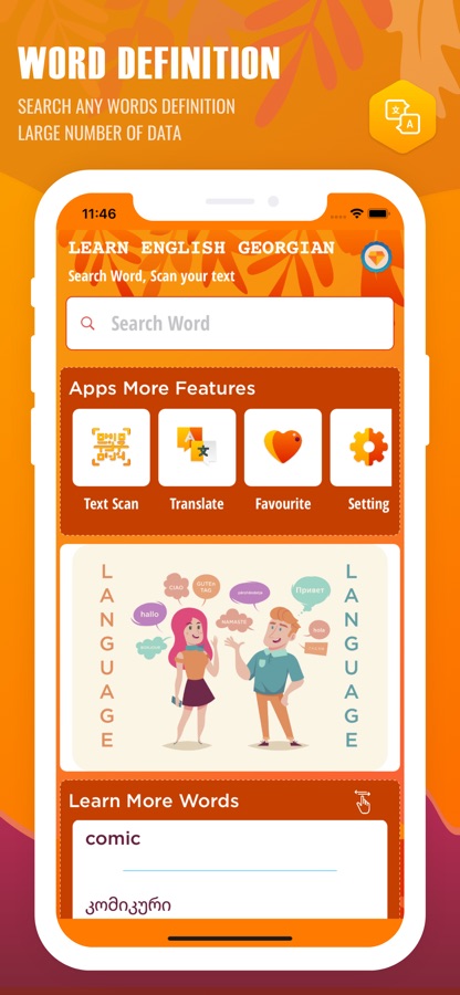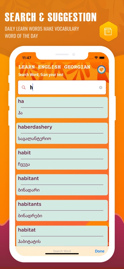 English Georgian dictionary will help to improve your English in both writing and reading. Soon English to the Georgian dictionary will have English lessons. You can practice your English vocabulary and comprehension with this English Georgian dictionary app.