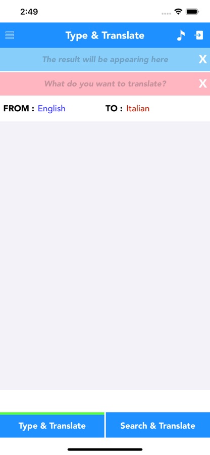 Look up default English to Italian or Italian to English sentences and phrases or manually type your own English to Italian or Italian to English words and sentences with a few clicks.