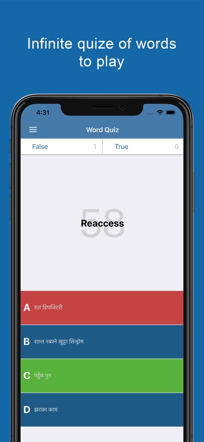 — We developed a new quiz inside Nepali dictionary! To take the quiz, you can easily tap the option icon in the top left side of the screen and choose quiz. Now, you will see a word in the screen with 4 answers, you will have to tap the answer that you think its right to see if it’s the good choice or not.