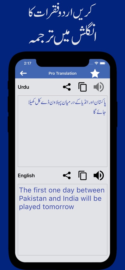 Translates sentences — English to Urdu Translator Pro App not only translate urdu word into english or english into urdu It also translates sentences . If user want to find translation of urdu or english sentences this app serves as best for the urdu into english translator or english into urdu translator for sentences.