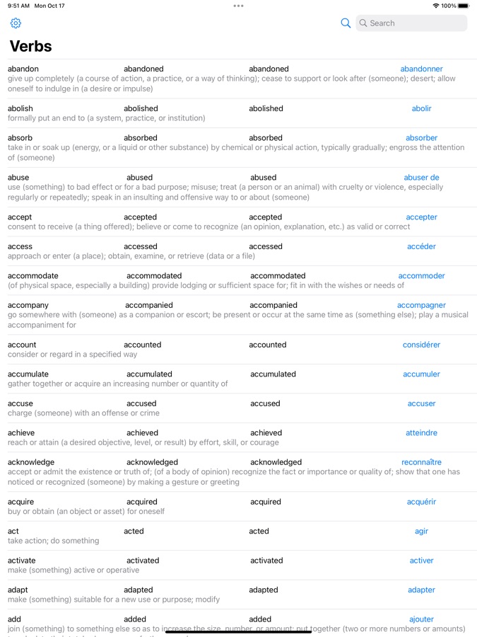 — Переводы глаголов для: французского, испанского, португальского, немецкого, русского, индонезийского, итальянского, японского, корейского, голландского, норвежского, шведского, китайского и арабского языков.
