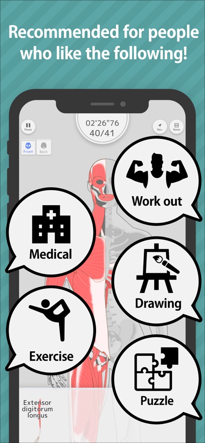 This app is recommended for those who are studying medicine and want to learn the names and locations of muscles, those who want to study muscles and become muscular efficiently, etc., and those who want to spend quality time with educational apps.